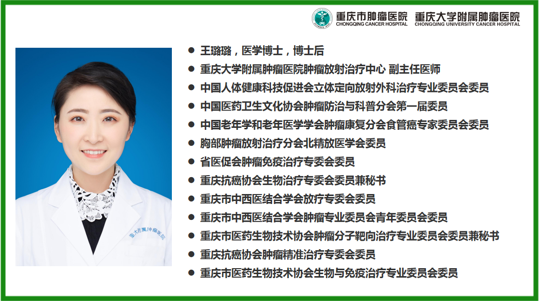 王璐璐,医学博士、博士后,重庆大学附属肿瘤医院肿瘤放射治疗中心副主任医师,重庆市抗癌协会生物治疗专委会委员兼秘书、肿瘤精准治疗专委会委员。长期深耕肿瘤诊疗领域,擅长肺癌、结肠癌、直肠癌等恶性肿瘤的综合治疗,尤其在分子靶向治疗及免疫治疗方面有着深厚的研究与丰富的临床经验。主持重庆市科研院所、中国癌症基金会等课题3项,重点参与课题4项。作为胸部肿瘤精准诊疗领域的资深专家,在肿瘤防治、健康科普方面拥有深厚的专业积累与丰富的实践经验,能够用通俗易懂的语言为师生普及科学的肿瘤防治知识。